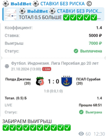 В Telegram BoldBet подписчикам доступны бесплатные ставки на футбольные матчи по линии прематч. Участие в VIP-лестнице каппера за 2000 рублей увеличивает первоначальный банк клиента в 50 раз.